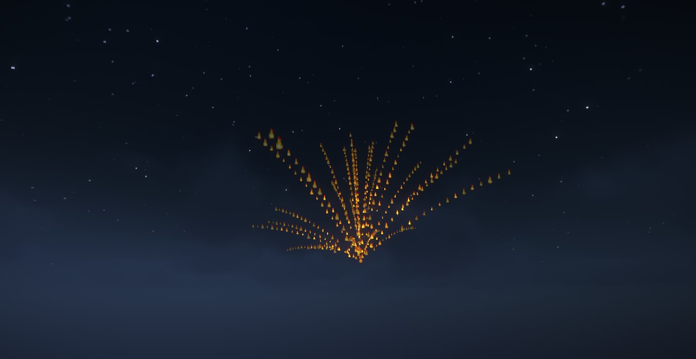 | function sklibs:skfirework/fx/launch { config:{ life:50, cmdv:[ { cmd:"function sklibs:skfirework/fx/spread", args:{ config:{ n:30, v:0.5, g:0.04, tick_cmdv:[{cmd:"particle flame ~ ~ ~ 0 0 0 0 1 force"}], cmdv:[ { cmd:"function sklibs:skfirework/fx/firework", args:{ config:{ shape:0, colors:[ {from:[I;13047173],to:[I;16761035]}, {from:[I;16711680],to:[I;10824234]} ], n:1 } } }] } } }] } }