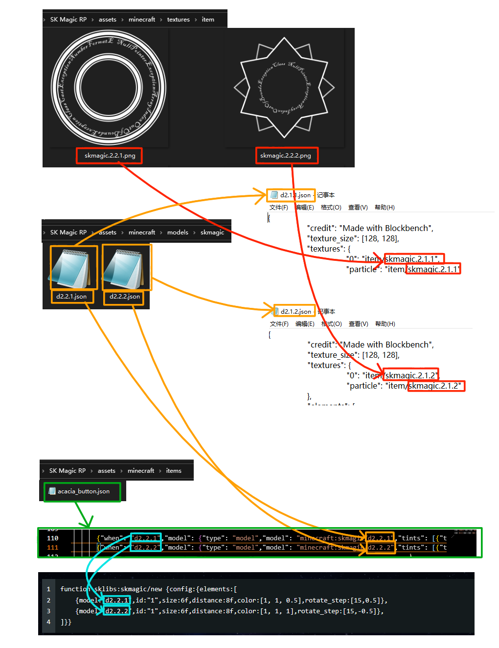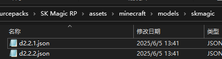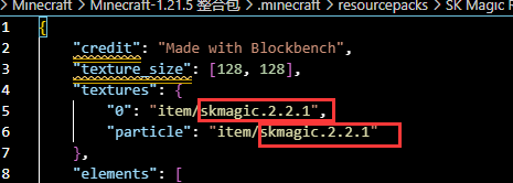 来到(资源包)/assets/minecraft/models/skmagic文件夹下,找到demo.json复制一份,文件名任意,打开新复制的json文件,填入刚才做好的材质文件的文件名,注意这里的文件名没有.png后缀,如图所示